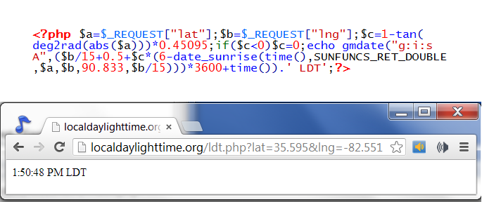 One line of php makes a Local Daylight Time API server. Here's the URL for Asheville time, put in your own latitude and longitude. http://localdaylighttime.org/ldt.php?lat=35.595&lng=-82.551